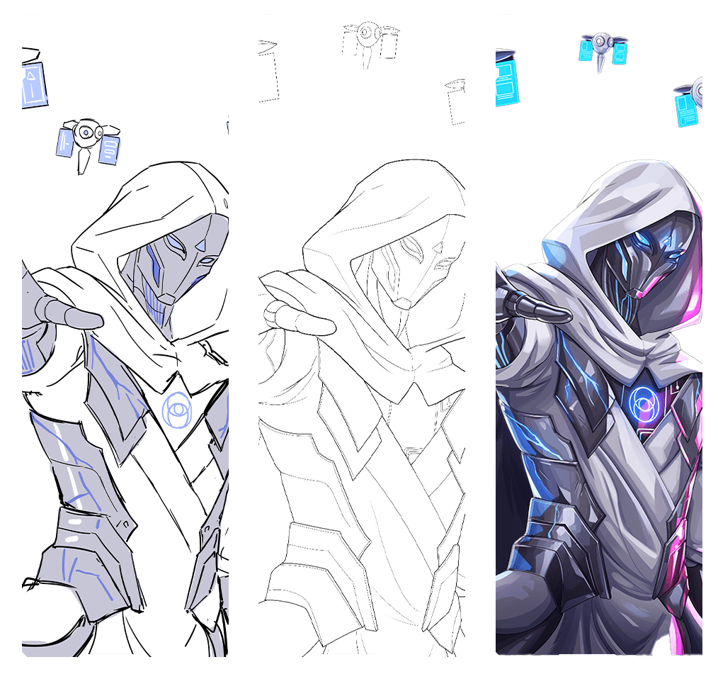 The Lost Sentinel’s design reflects endurance shaped by time. Its silhouette is eerily tall, grounded and immovable, built to feel ancient yet ahead of its time. Its armour is composed of matte black and gunmetal plates, fractured in places to reveal glowing blue-white circuitry beneath. Some sections phase between solid metal and holographic form, suggesting a body sustained as much by core purpose as by machinery.